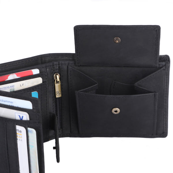 Gefertigt aus robustem Büffelleder, bietet die Börse ein durchdachtes Innenleben mit 8 Kartenfächern, zwei großen Scheinfächern und einem Münzfach mit Druckknopf. Alles sitzt perfekt und bleibt an Ort und Stelle – ganz gleich, ob du unterwegs bist oder gemütlich auf dem Balkon sitzt. Dank der kompakten Maße passt sie problemlos in jede Hosentasche und ist trotzdem erstaunlich geräumig.