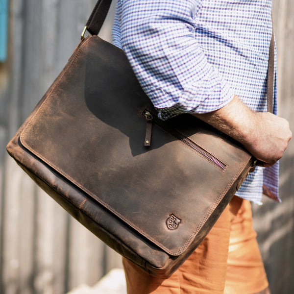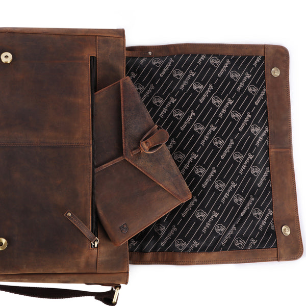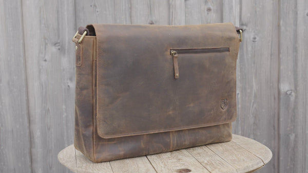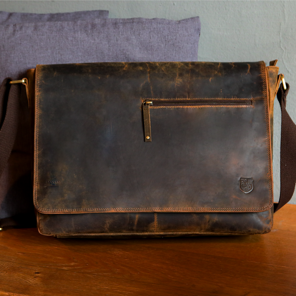 Die Laptop Tasche Ben aus hochwertigem, braunem Vintage-Büffelleder vereint zeitlose Eleganz mit außergewöhnlicher Widerstandsfähigkeit. Das naturbelassene, geölte und geschliffene Leder entwickelt mit der Zeit eine einzigartige Patina, die ihr einen unverwechselbaren Charakter verleiht. Dank des durchdachten Innenlayouts bietet sie großzügigen Stauraum für Laptops, Dokumente und persönliche Gegenstände – perfekt für den Berufsalltag, Uni oder Freizeit.
