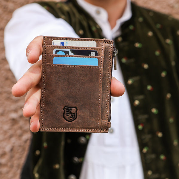 Das ist ganz einfach: Wir fertigen unsere Geldbeutel ausschließlich per Hand aus echtem vollnarbigen Büffelleder, welches als das robusteste Leder der Welt gilt. Zusätzlich versiegeln wir durch die besondere Schleiftechnik die Oberfläche der Geldbeutel. Während der Verwendung unserer Geldbeutel entsteht dadurch eine lebendige Patina die den individuellen Charakter dieses ausdrucksstarken Leders unterstreicht.