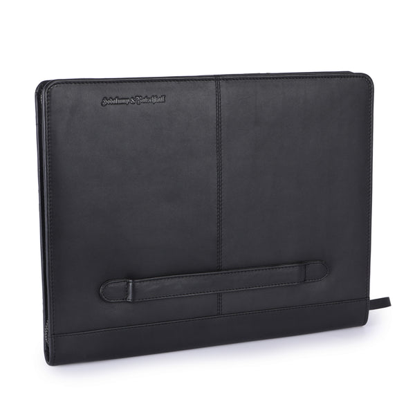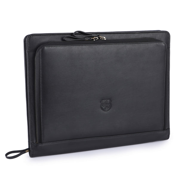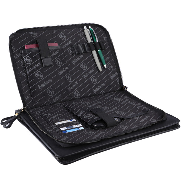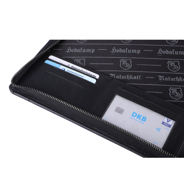 Im Inneren bietet die Mappe Platz für A4-Dokumente, Notizblock, Tablet und Visitenkarten. Durch integrierte Fächer hast du alle wichtigen Unterlagen übersichtlich geordnet und sofort griffbereit. Ein umlaufender Reißverschluss sorgt für sicheren Verschluss, während das stabile Leder außen alles schützt, was du innen unterbringst.