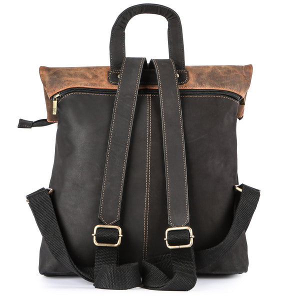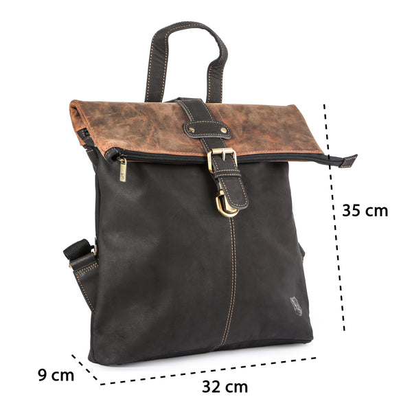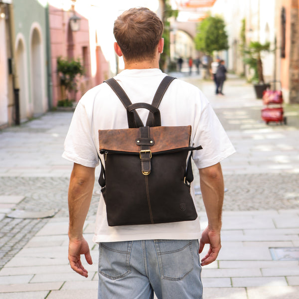 Person trägt braunen Hodalump Rucksack aus Leder im rustikalen Vintage Stil.
