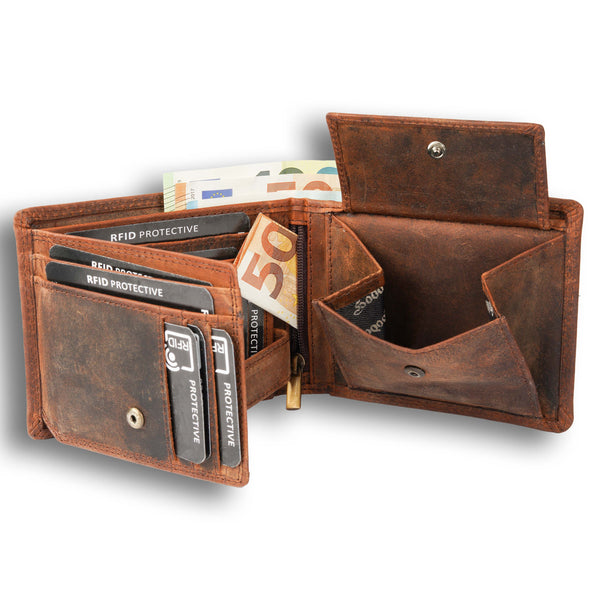 Im Inneren überzeugt die Wappen Lugge mit durchdachter Aufteilung: Zahlreiche Kartenfächer, ein großes unterteiltes Scheinfach, ein separates Münzfach mit Druckknopf sowie ein Sichtfenster für Ausweis oder Führerschein bieten dir Ordnung auf kleinstem Raum. Das Leder liegt angenehm in der Hand und entwickelt mit der Zeit eine individuelle Patina – genau wie du.