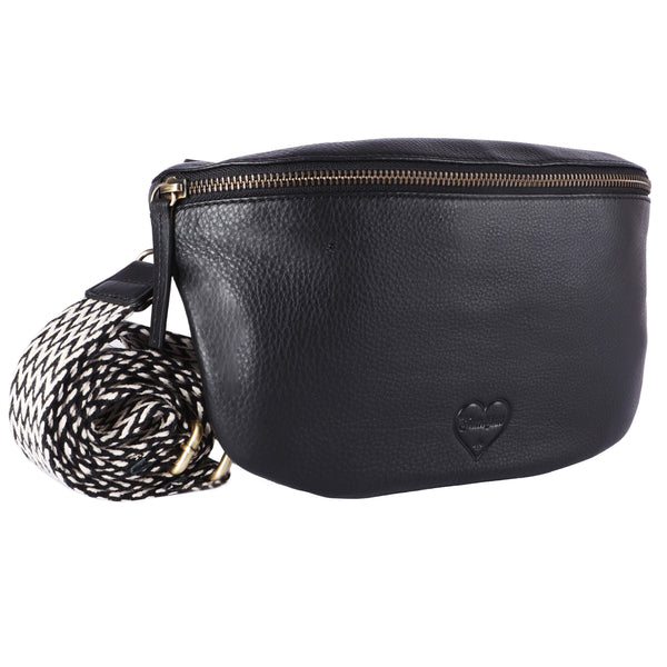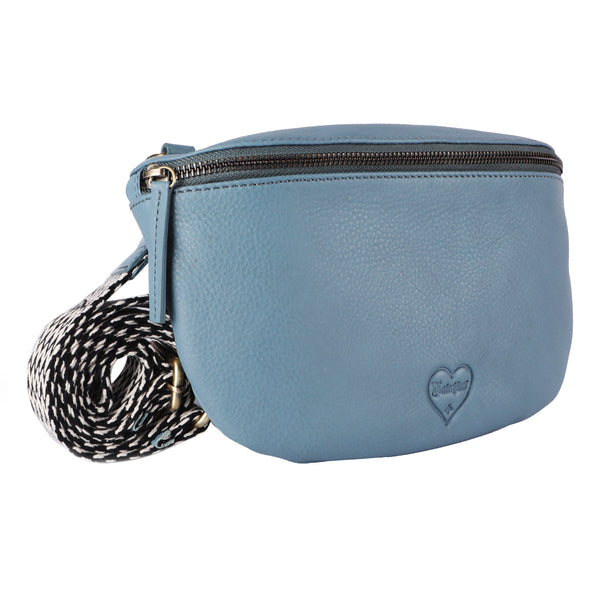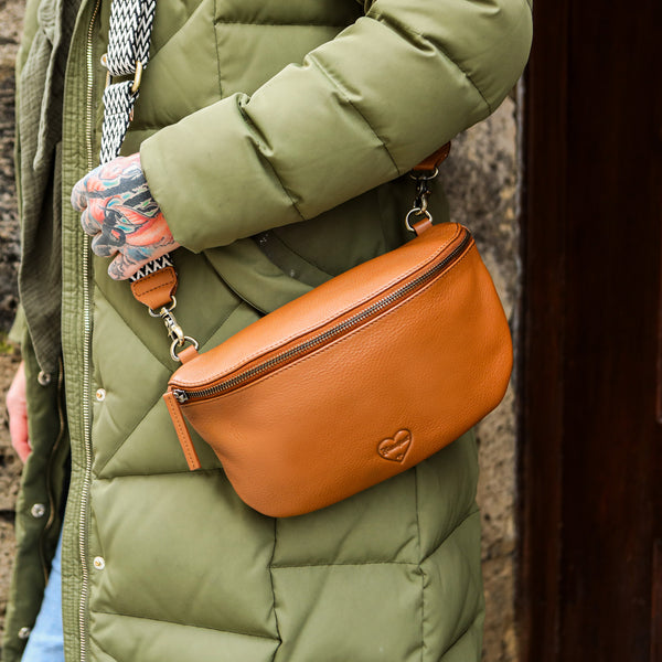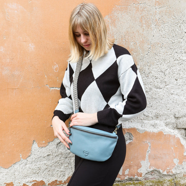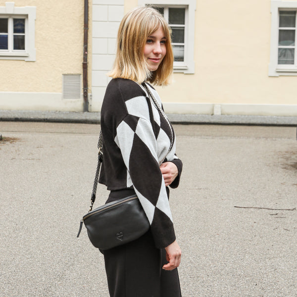 Eine schnuckelige kleine Tasche, die Bauchtaschenoptik mit Crossover vereint. Es passt ein Päckchen Taschentücher, ein Schlüsselbund und, das war für mich ganz wichtig, die Geldbörse Gretl hinein.