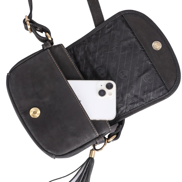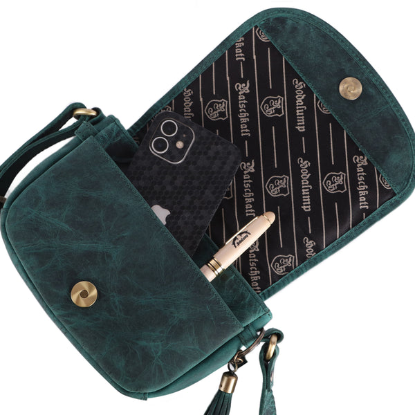 Gefertigt aus robustem Canvas mit Echtleder-Akzenten bringt die Tasche rustikalen Charme und Stabilität in Einklang. Im Inneren bietet sie genügend Platz für Geldbörse, Handy, Schlüssel und alles, was du unterwegs brauchst. Ein praktischer Magnetverschluss sowie der längenverstellbare Umhängegurt sorgen für Komfort und Sicherheit. Das gestickte oder geprägte Motiv mit Ratschkatl-Flair rundet das Design perfekt ab.